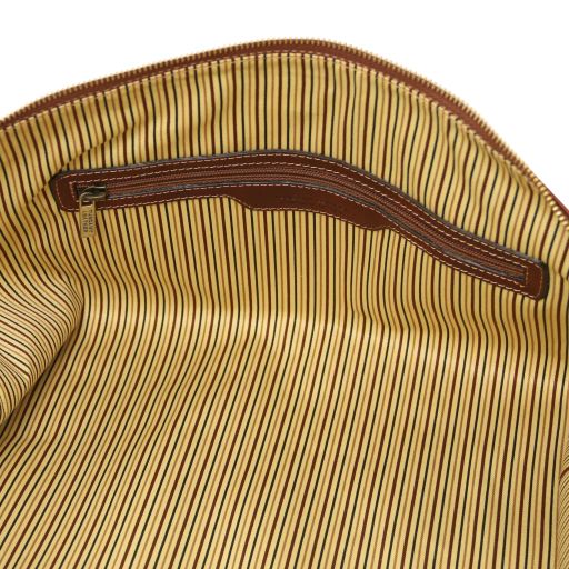 Tipologia: Borsa Weekend - Composizione: Pelle pieno fiore conciata al vegetale tamponata a mano, Fodera in cotone - Caratteristiche: Costruzione morbida, 1 scomparto - Descrizione esterna: Logo Tuscany Leather su rettangolo in metallo, Fondo con piedini in metallo, Tasca frontale con chiusura - Descrizione interni: Tasca con zip, 2 tasche aperte - Tracolla: Tracolla regolabile e staccabile in pelle - Parti metalliche: Cerniere in metallo YKK, Accessori color ottone spazzolato - Chiusura: Chiusura con zip - Accessori: Sacca protettiva, Etichetta bagaglio